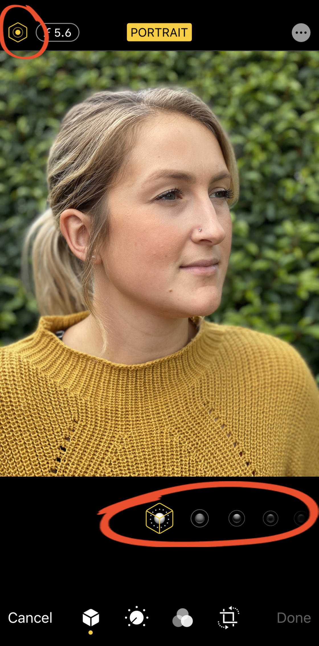 Чтобы поэкспериментировать с параметрами портретного освещения, нажмите значок Портретное освещение в верхней левой части экрана редактирования. Затем проведите пальцем по значкам Портретного освещения под изображением.
