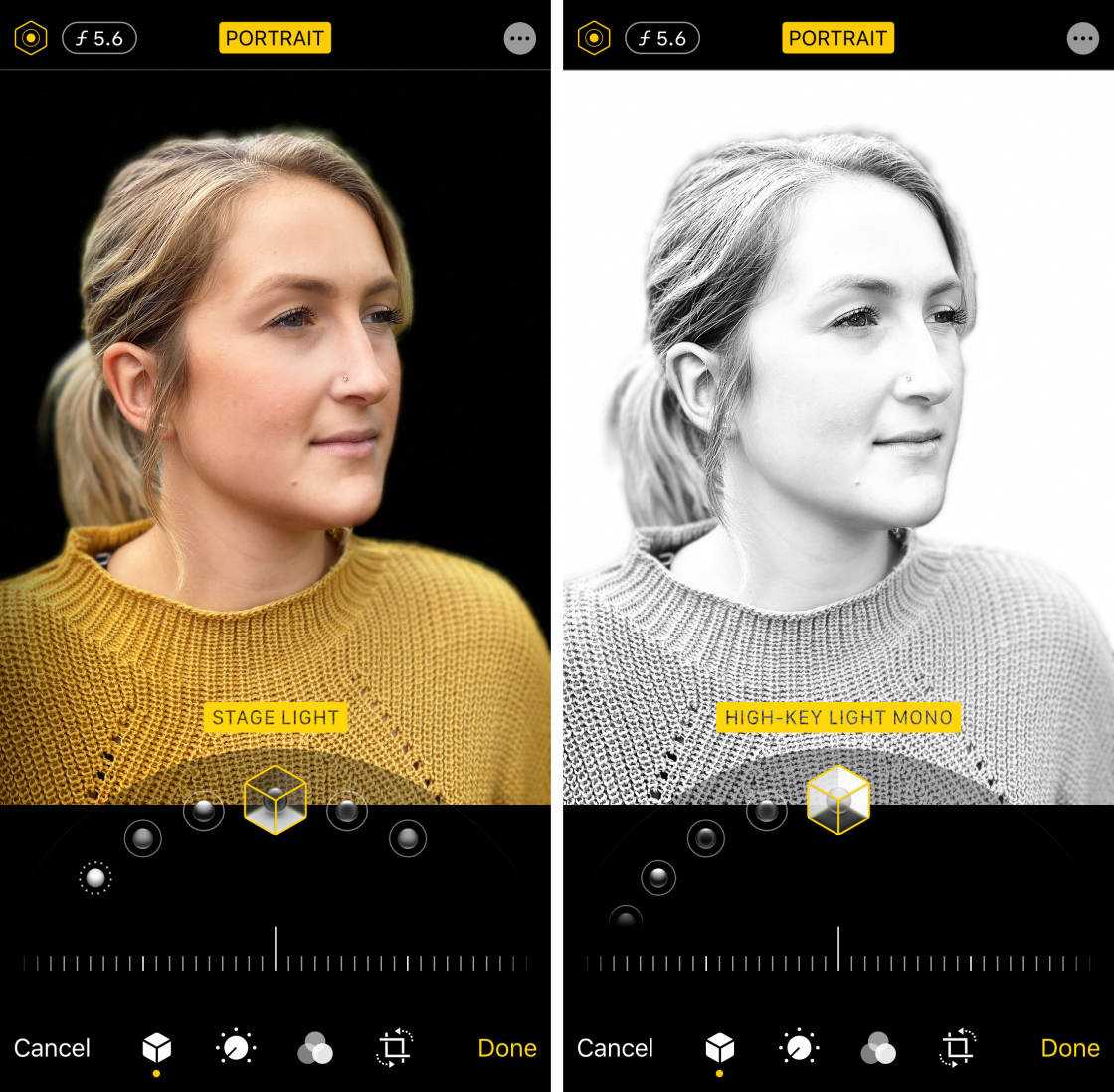 Stage Light делает фон полностью черным. Stage Light Mono похож на Stage Light, но превращает вашу фотографию в черно-белую. А High-Key Light Mono создает черно-белую фотографию с белым фоном.