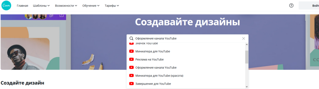 - После того как мы зарегистрируемся, перед нами отобразится личный кабинет. В верхней правой части выбираем «Создать дизайн» и вводим запрос «YouTube». Затем нажимаем «Оформление канала YouTube».
