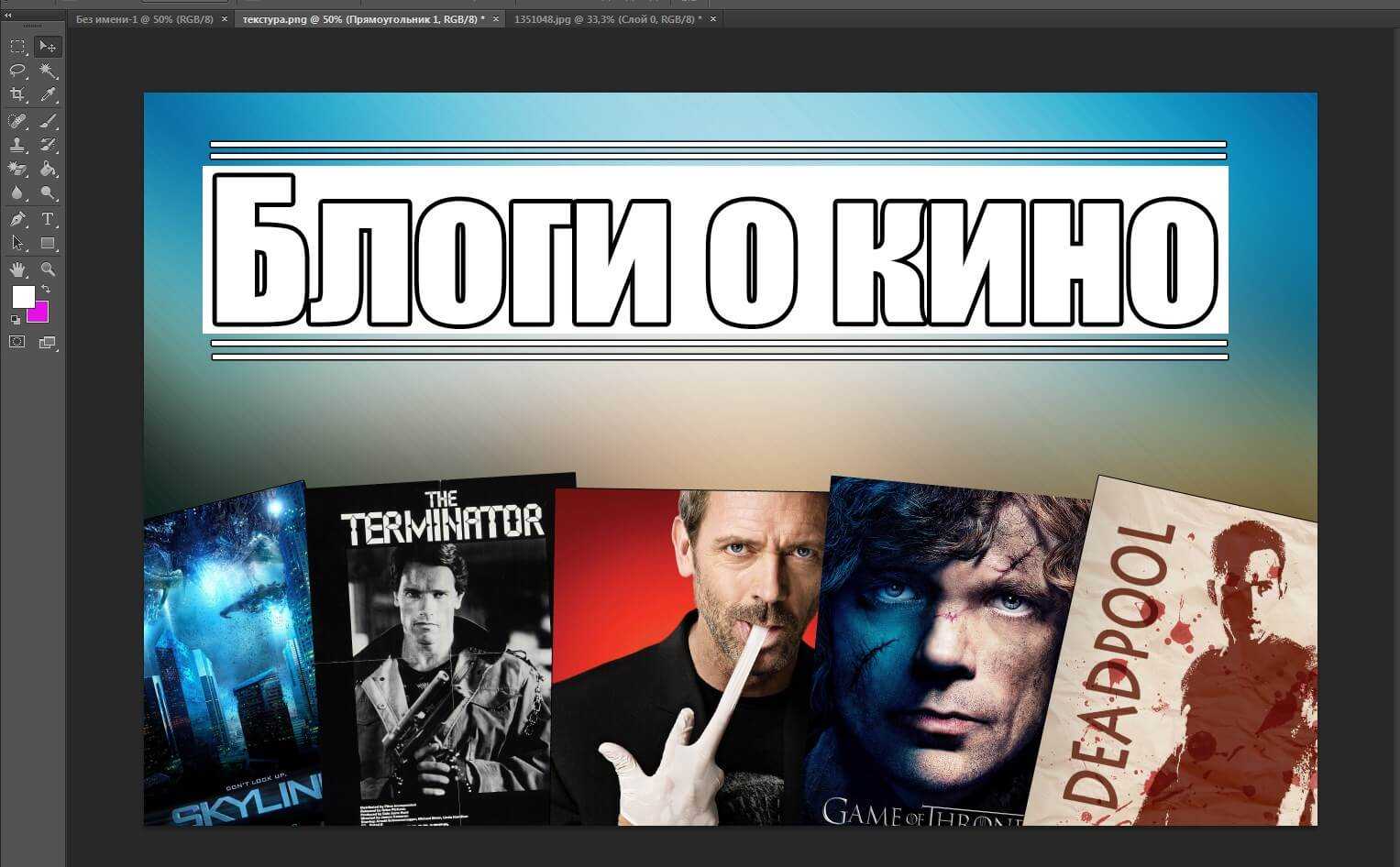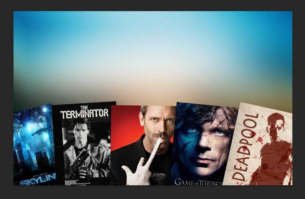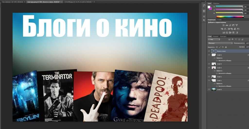Шаг 3. Далее на имеющийся у нас фон необходимо поместить изображение, которое будет отражать тематическую направленность канала. Представим, что это канал с обзорами фильмов и сериалов. Скачиваем нужные изображения, редактируем их на свой вкус и точно так же перетаскиваем их с рабочего стола в программу. Изображения лягут на имеющийся фон новым слоем, и их отдельно можно будет трансформировать и перемещать. Должно получиться нечто подобное: