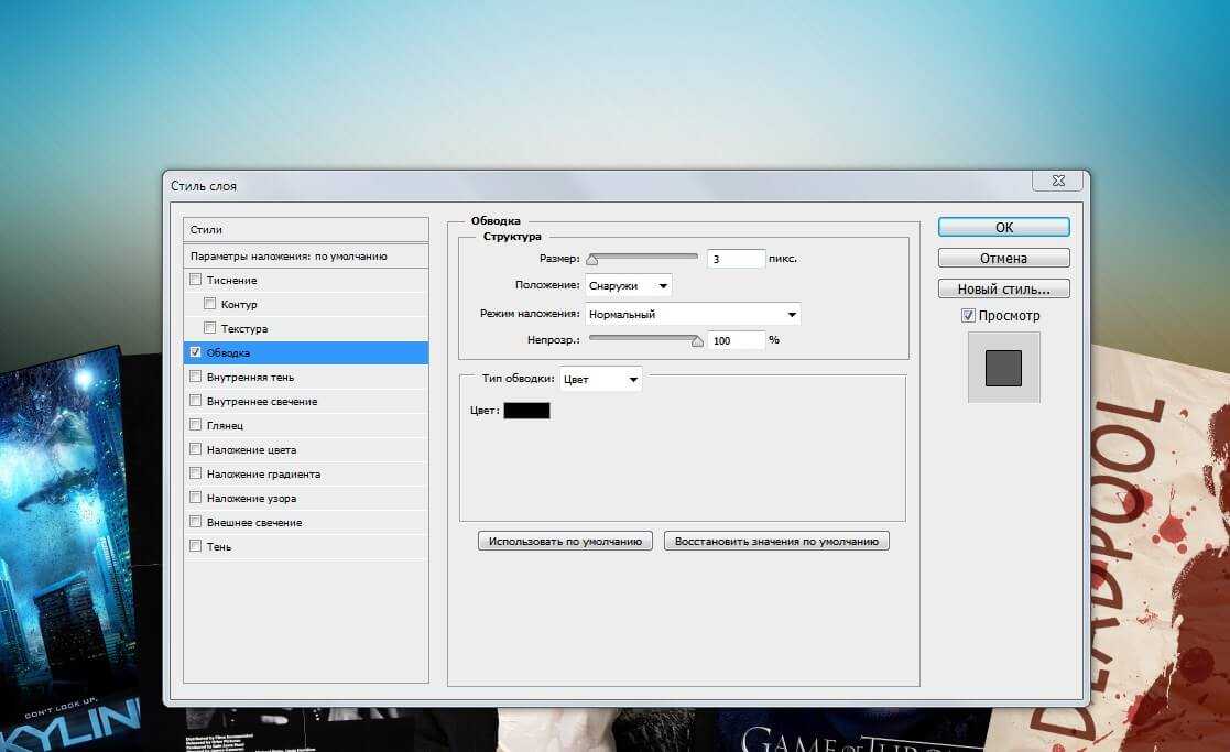 Шаг 6. Чтобы текст смотрелся более интересно, его тоже можно выделить тенями или контуром, нажав по слою правой кнопкой мыши и выбрав пункт «Стиль слоя». На картинке к нему был применён эффект «Обводка» с размером в 10 пикселей, благодаря чему он стал выделяться на фоне.