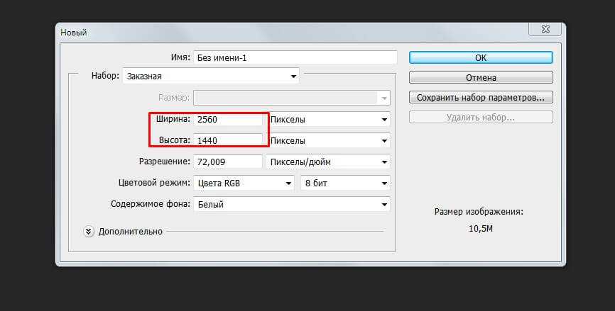 - Выбрать «Файл», далее «Новый». Задать размеры (шаблон шапки для youtube 2560 х 1440). Другие настройки в окне нужны дизайнерам, – их не трогаем.