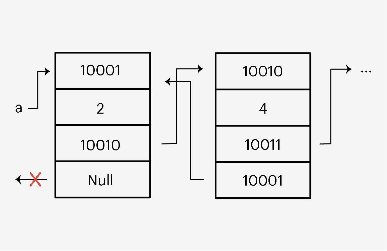 Проблема в том, что a — это ссылка на область в памяти компьютера, где хранится первый элемент списка, а также на следующий его элемент. Вот как всё это устроено в памяти компьютера: