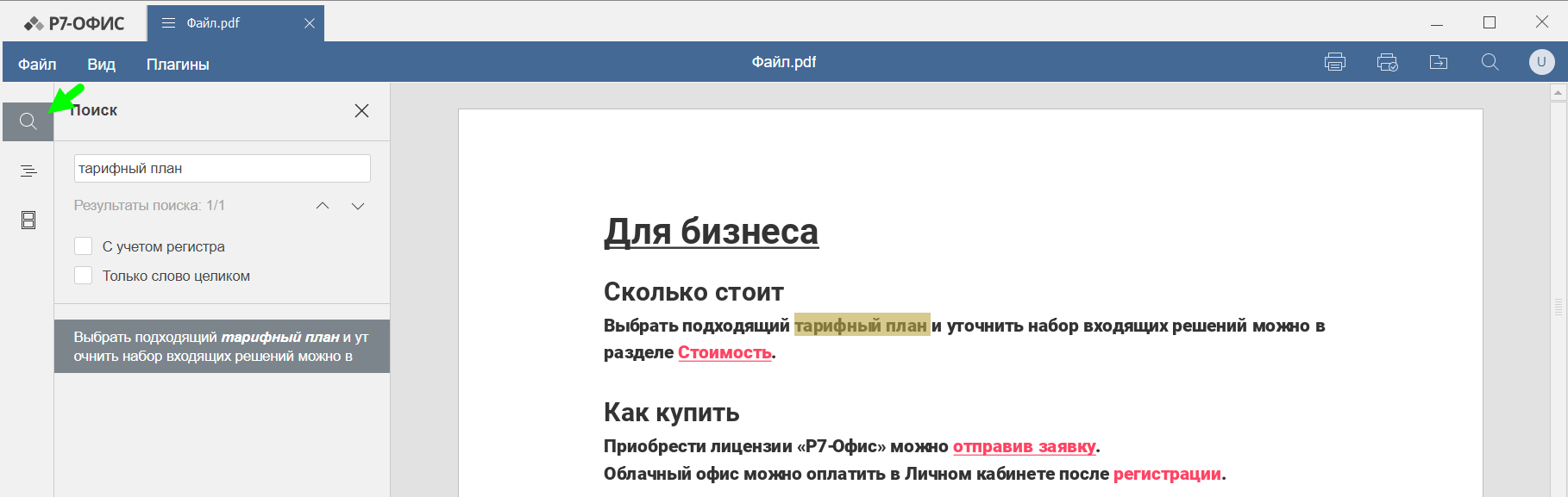 В «Р7-Офис» можно использовать поиск по PDF-документу. Нужно кликнуть на значок лупы на левой панели и в строке поиска указать искомое слово. Можно выбрать поиск с учетом регистра или точности слова.