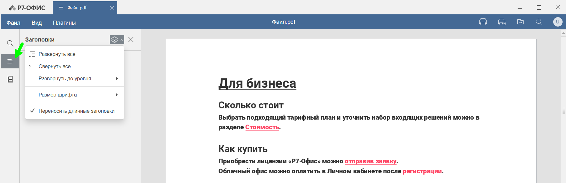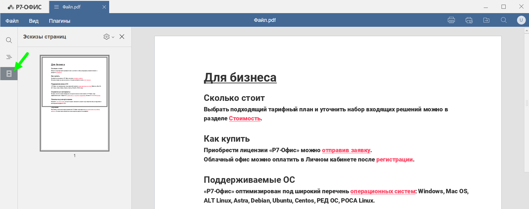 Для работы с PDF-файлами в «Р7-Офис» предусмотрено несколько полезных функций.