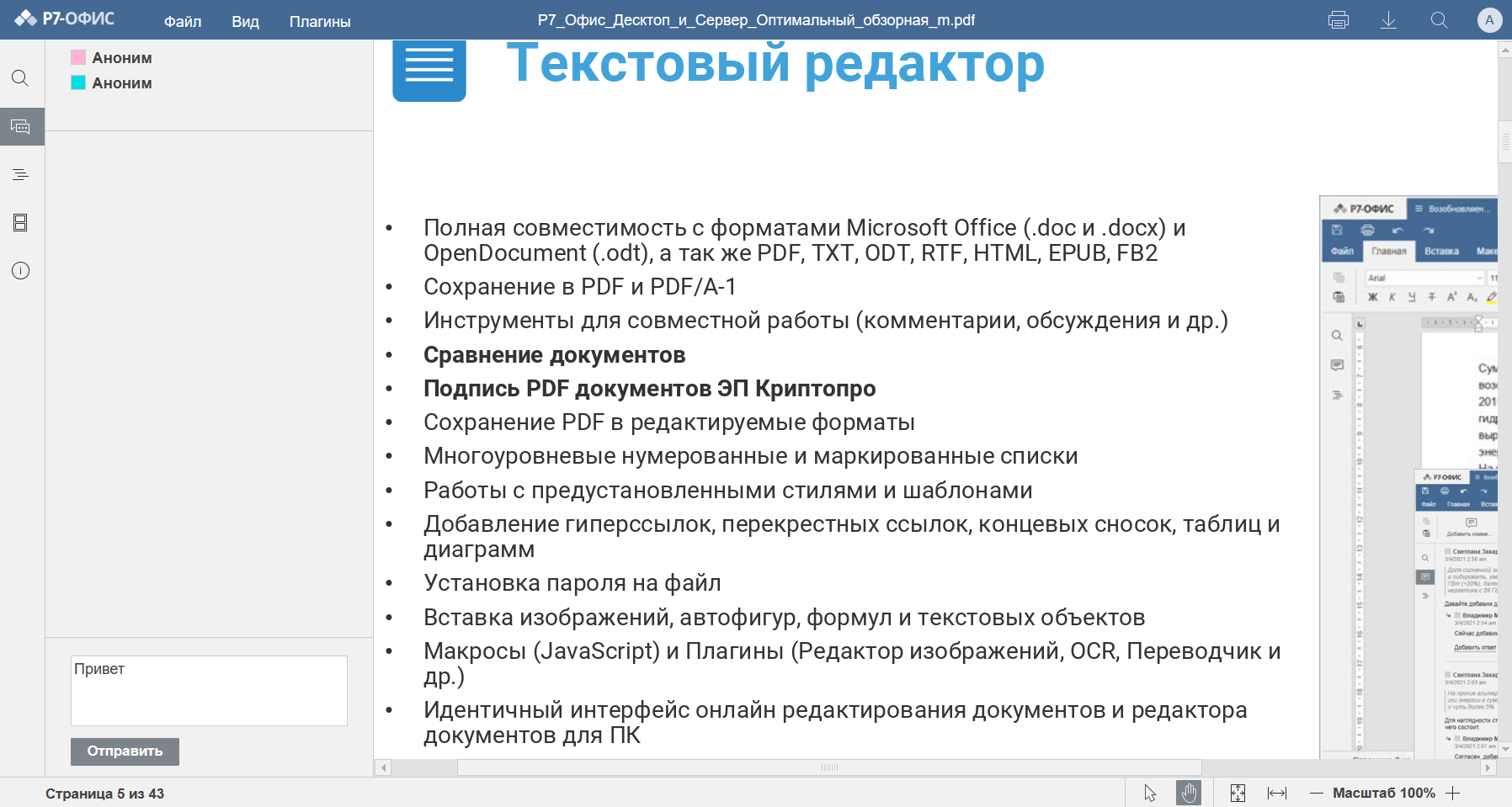 Также в «Р7-Офис» доступен чат, в котором пользователи могут общаться, не выходя из документа.