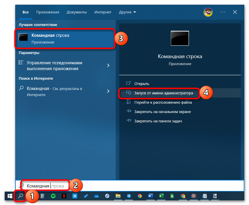 - Запустите «Командную строку» от имени администратора. Для этого можно воспользоваться соответствующим пунктом дополнительного меню, вызываемого нажатием «ПКМ» по меню «Пуск», или задействовать системный поиск.