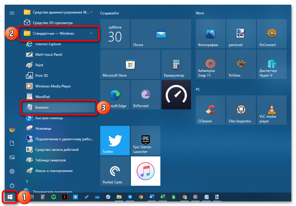 Альтернативный вариант: меню «Пуск» — папка «Стандартные – Windows» — «Блокнот».
