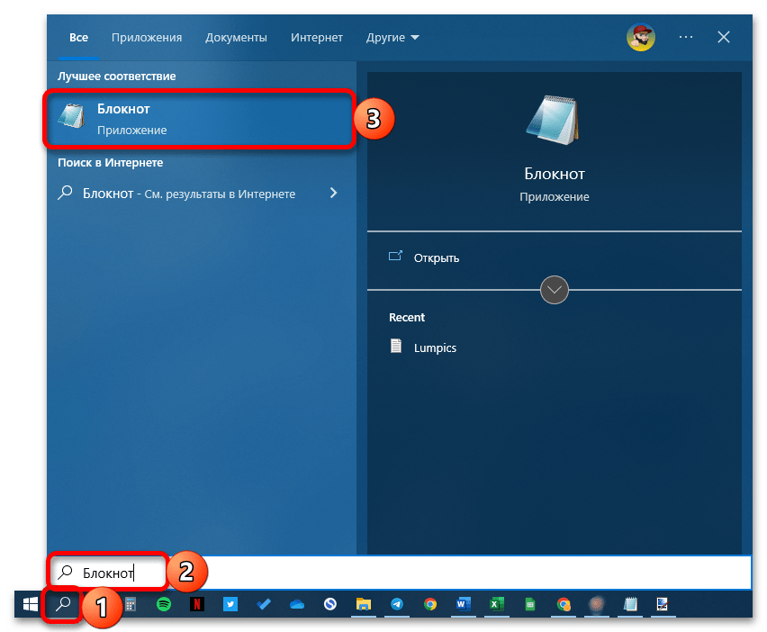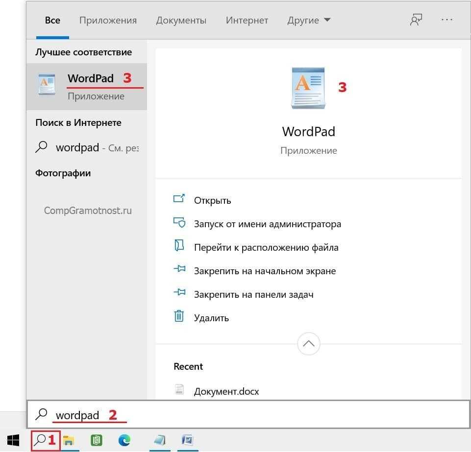 В нижнем левом углу есть значок лупы (цифра 1 на рисунке 1). Кликните на него и введите без кавычек «wordpad» (2 на рис. 1). В итоге на компьютере будет найдена программа WordPad (3 на рис. 1).