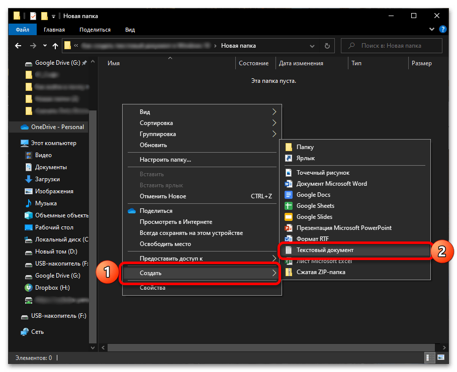 Самым простым и быстрым методом создания текстового документа на компьютере или ноутбуке с ОС Windows 10 будет использование соответствующего пункта контекстного меню. Просто кликните правой кнопкой мышки (ПКМ) в пустом месте рабочего стола или папке, в которую хотите поместить файл, и перейдите последовательно по пунктам «Создать» — «Текстовый документ».
