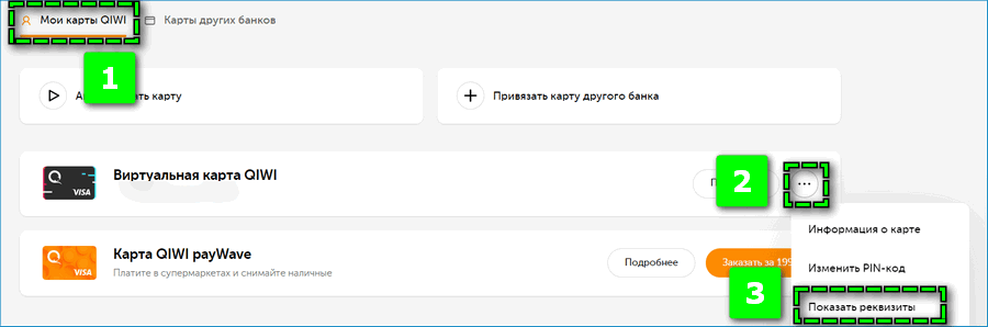 Чтобы узнать реквизиты виртуальной карты Киви Кошелька:
