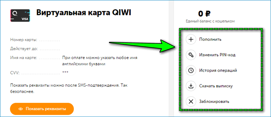 На странице с реквизитами виртуальной банковской карточки справа присутствует панель, которая позволяет: