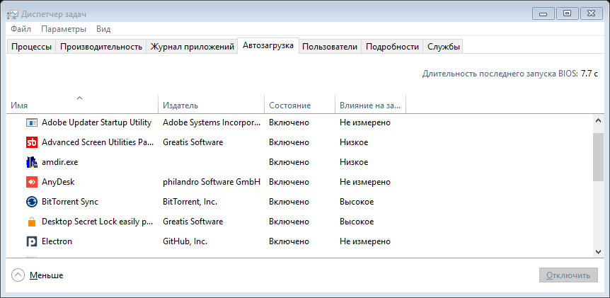 Также в Диспетчере задач следует зайти во вкладку Автозагрузка и отключить все записи, касающиеся запуска неизвестных вам сторонних программ.