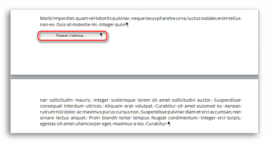 Разрыв страницы/раздела отображается пунктирной линией. Если таких линий в документе не видно, переключитесь в режим отображения черновика (через вкладку «Вид»).