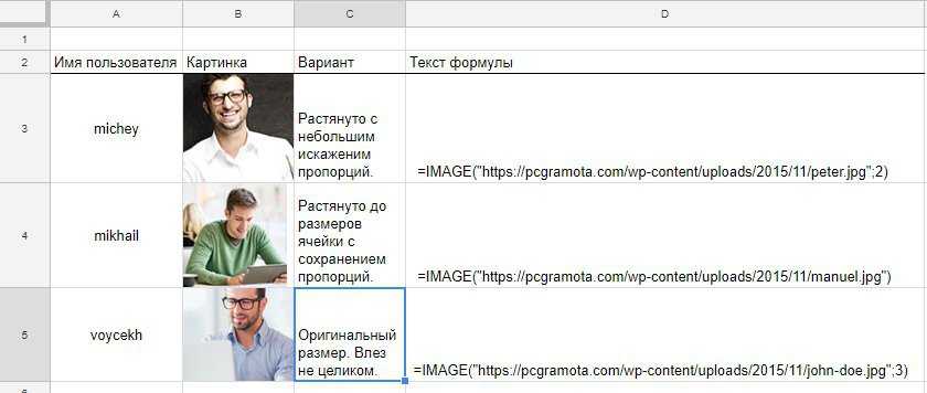 Обратите на разницу при вставке изображений в примере. В первом случае имеются небольшие искажения пропорций, во втором — свободное место в ячейке рядом с фото, а третья картинка влезла в ячейке не полностью. Копии формул для вставки данных изображений в таблицу Google приведены в колонке D.