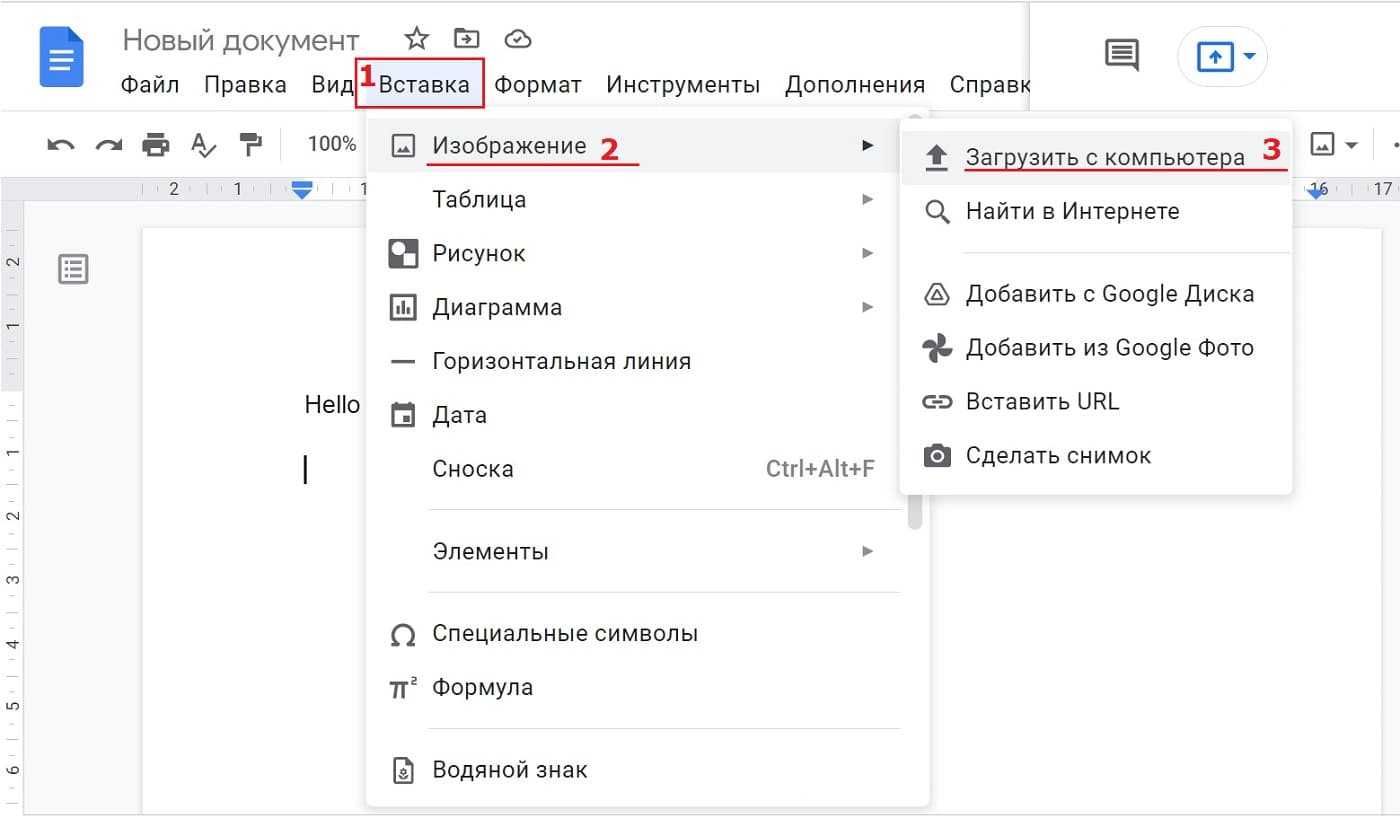 Итак, курсор находится в том месте, где нужно вставить картинку. В верхнем меню Гугл Док нажимаем «Вставка» — » Изображение» — «Загрузить с компьютера» (это цифры 1, 2 , 3 на рис. 1).
