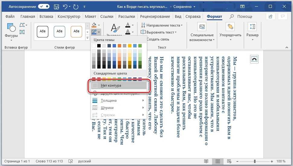 Последний момент, который связан лишь с визуальной составляющей. Вы уже знаете способ, как писать вертикально в Ворде. Но многим хотелось бы, чтобы отсутствовали лишние фрагменты. Например, речь может идти о рамке. Алгоритм её устранения таков: