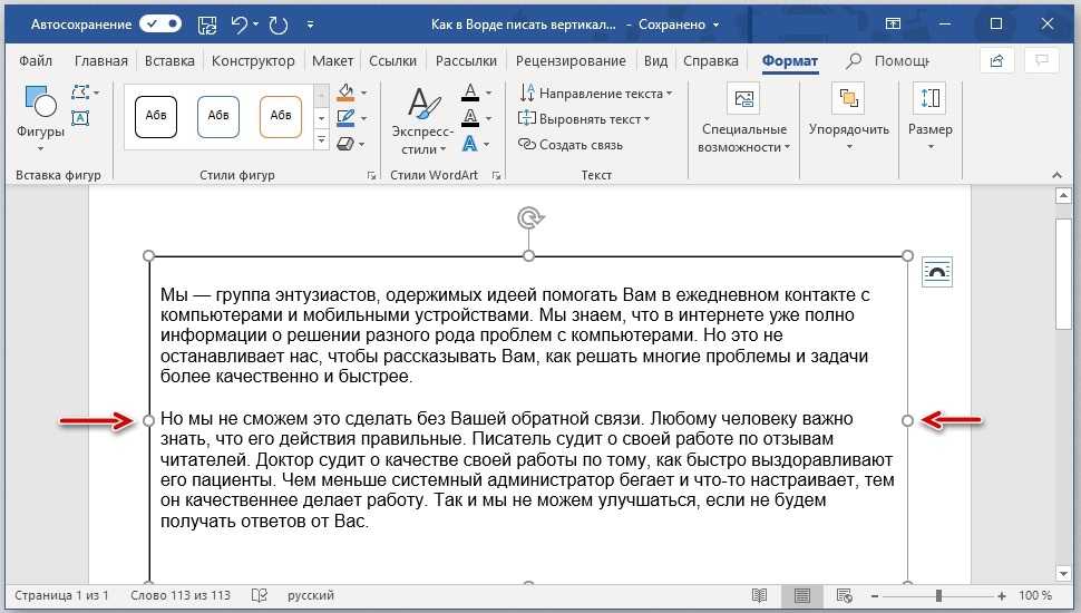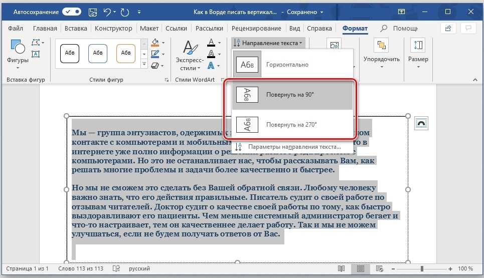 Позже на этой вкладке «Формат», нажав кнопку «Направление текста», измените направление текста, пока оно не примет нужное нам направление.