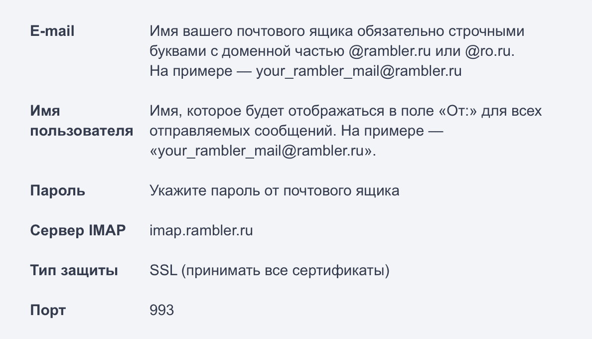 - Укажите данные сервера в соответствующих полях – в качестве сервера введите imap.mail.ru, а в качестве порта – 993