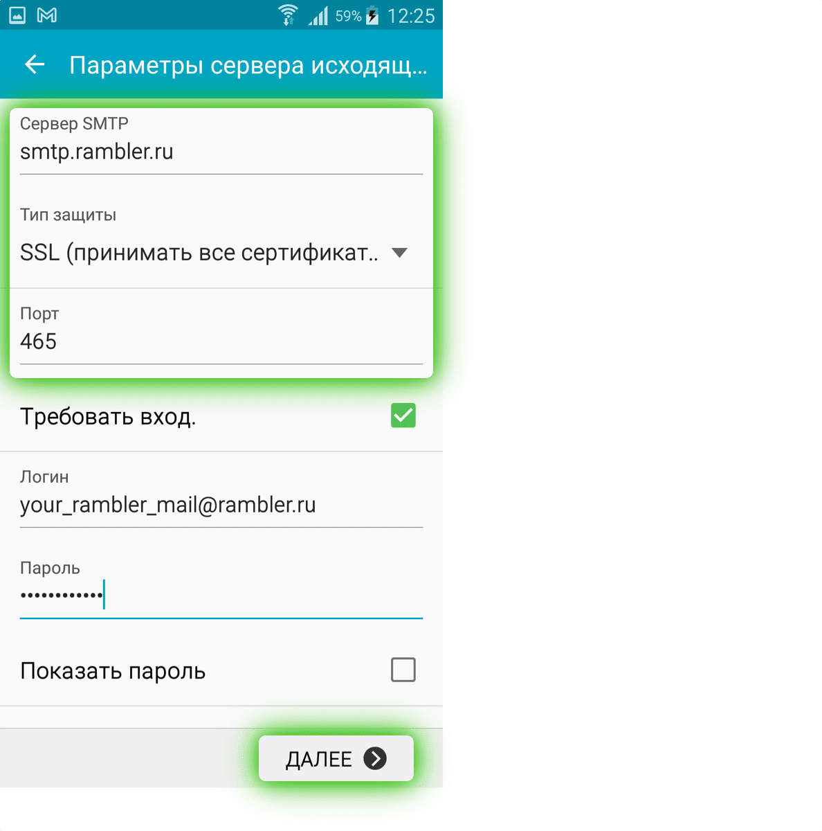 - В поле «SMTP-сервер» введите smtp.mail.ru, в качестве порта – 465 или 587
