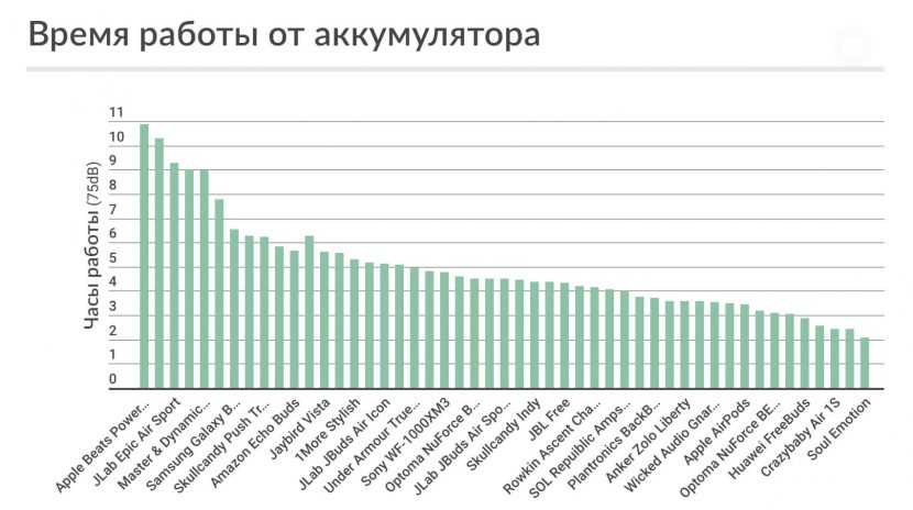 Время работы в тестах составило 5 часов 6 минут, для беспроводных наушников это результат выше среднего. Следует упомянуть, что Apple обещала 4,5 часа непрерывного воспроизведения при громкости около 50%.