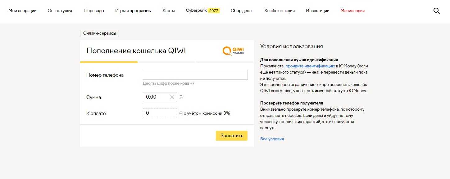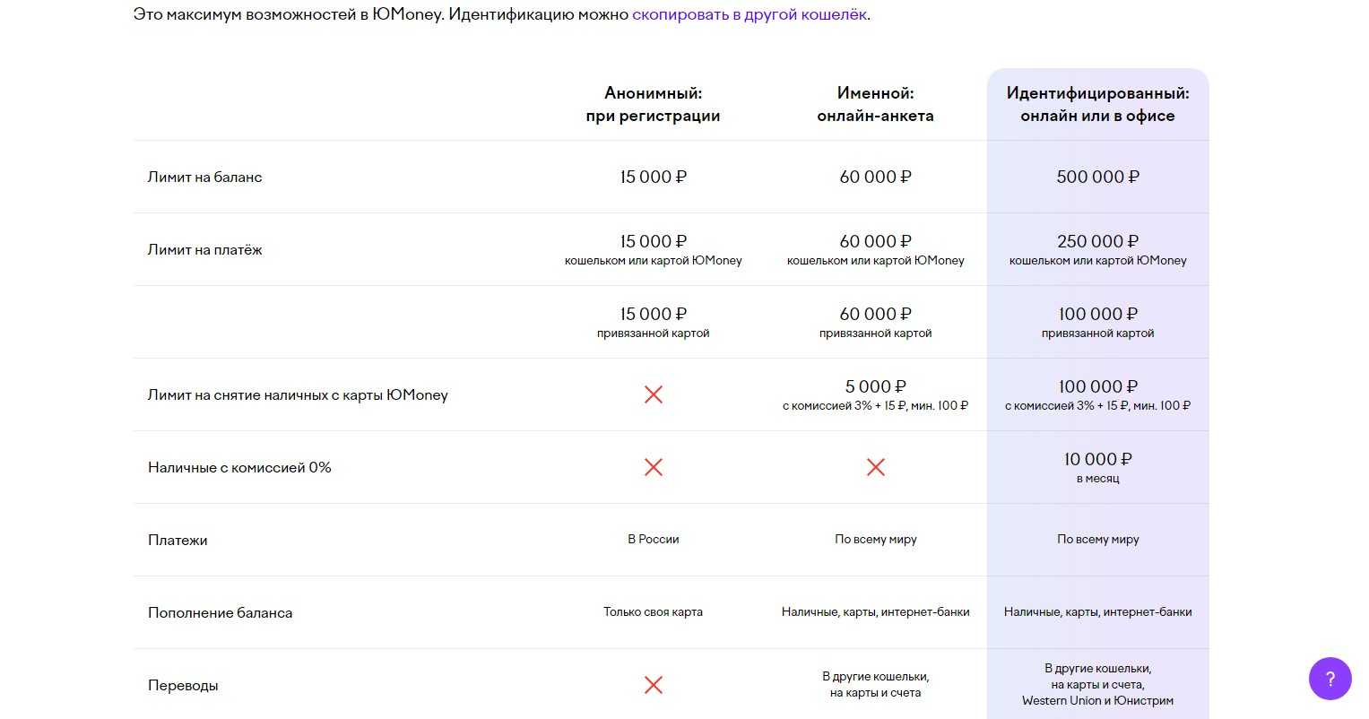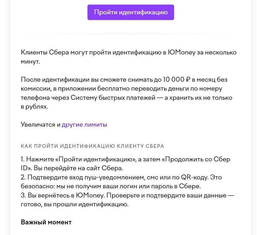 - Идентифицированным пользователям лимит на пополнение увеличивается до 100 000 рублей в месяц.