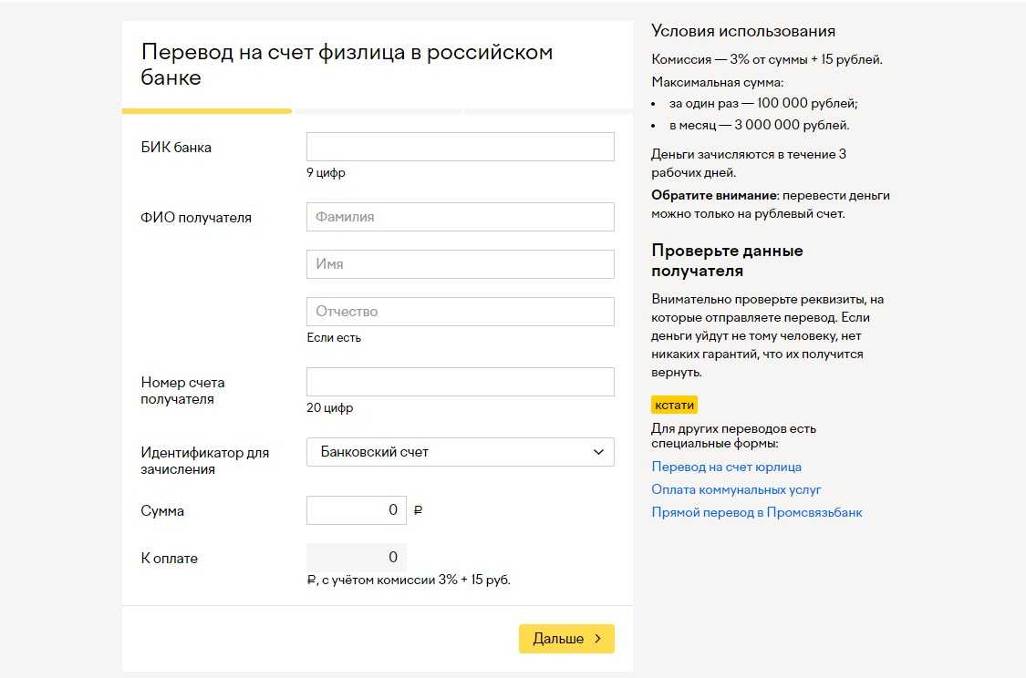 Перевод можно отправить физическому лицу на счёт в любом российском банке (кроме Промсвязьбанка).