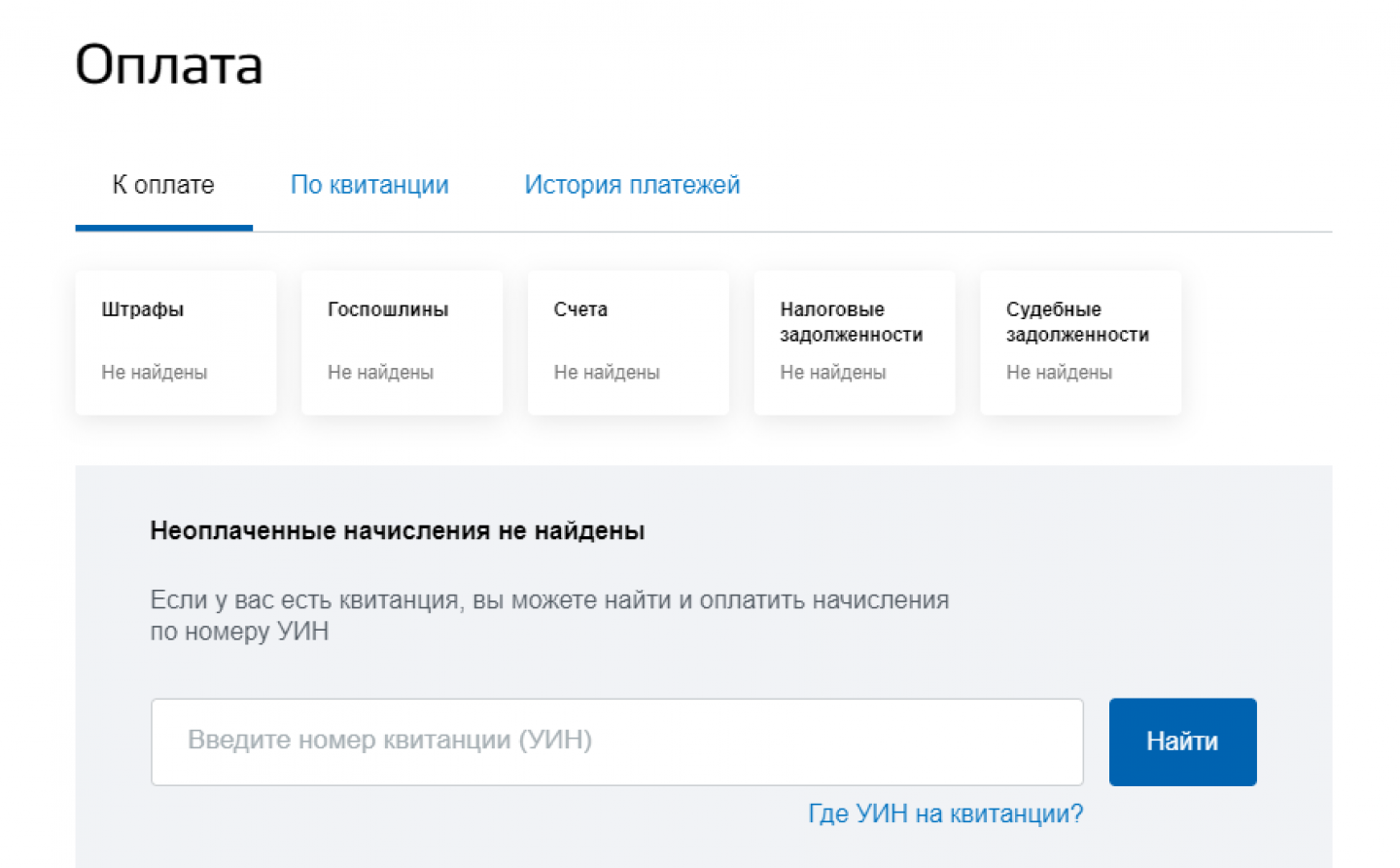 Если система не показывает, что есть задолженность, но у вас на руках есть квитанция, введите УИН (длинный код, который есть на квитанции) и проверьте долг. После этого его также можно оплатить через госуслуги.