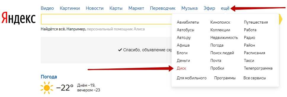Если вы еще не выполнили вход в почту, то над строкой поиска вы увидите пункты сервисов. Кликните по «ещё» и выберите «Диск».