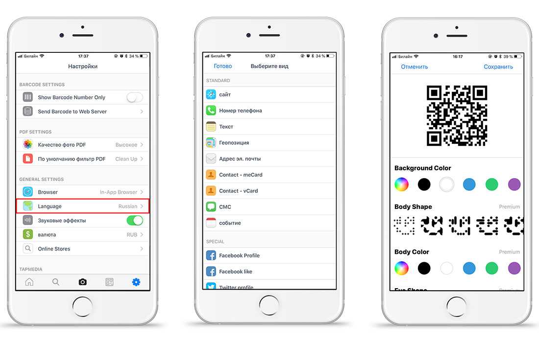 Для начала включите в настройках поддержку русского языка, потом перейдите в Генератор кодов и нажмите на «+». Вам будет предложено выбрать вид информации, которую вы хотите закодировать. На финальном этапе вы сможете настроить внешний вид вашего QR-кода и сохранить его в форматах PNG или SVG.