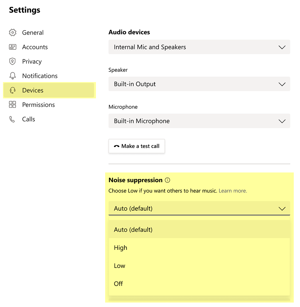 Microsoft Teams. Корпоративный мессенджер Microsoft, в котором настройки доступны в меню «Устройства». Есть несколько уровней шумоподавления, выбор устройств и тестовый звонок, чтобы проверить качество настройки аудиооборудования. Все примерно как в Skype, который тоже принадлежит Microsoft.