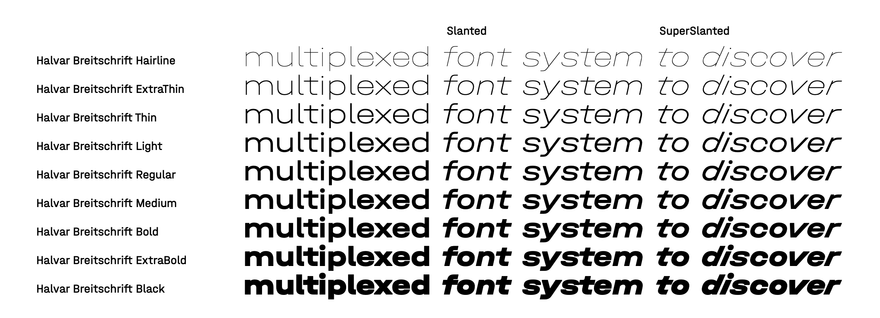 Halvar – это массивная система шрифтов, насчитывающая в общей сложности 162 стиля. Halvar и Halvar Stencil имеют три значения ширины (Wide, Normal и Condensed), а также девять весов (от Hairline до Black) с двумя вариантами курсива (Slanted и SuperSlanted). Halvar с громоздкими пропорциями и сложными формами представляет собой прагматичный гротеск. Halvar поддерживает расширенный латинский, греческий и кириллический алфавиты и имеет табличные цифры, надстрочные индексы, дроби, а также альтернативные символы.