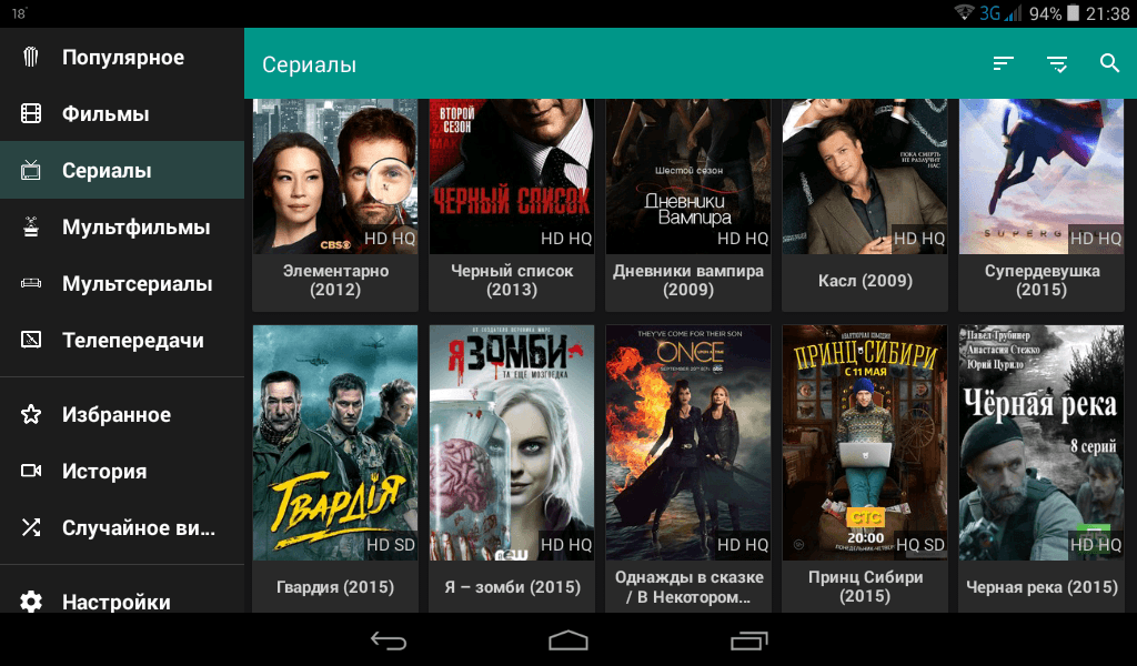 Навигация в приложении и поиск видеоконтента через HD VideoBox выполняется следующим образом. Запустив софт, пользователь попадает во вкладку «Новинки», где представлен последний контент, добавленный в базу. Другие категории доступны в меню (кнопка с тремя горизонтальными полосками вверху справа). Это «Фильмы», «Сериалы», «Мультфильмы», «Мультсериалы», «Телепередачи» и «Аниме». Можно выбрать необходимую вкладку и искать контент в ней, пролистывая базу видеозаписей. Для большего удобства доступна сортировка по дате обновления, году выпуска, популярности и рейтингу.