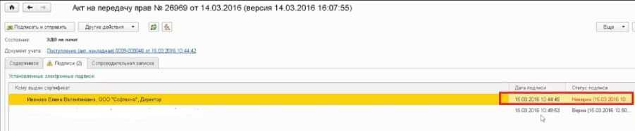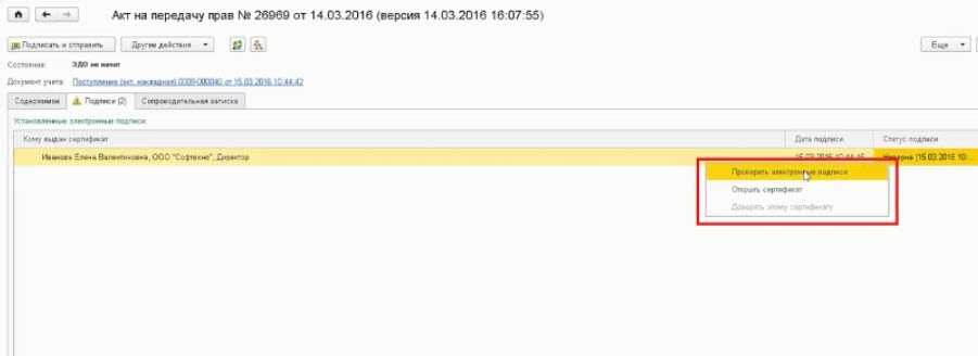 Перейдите в окно 1С. Нажмите на подпись со статусом Не верна и в контекстном меню выберите Проверить электронные подписи: