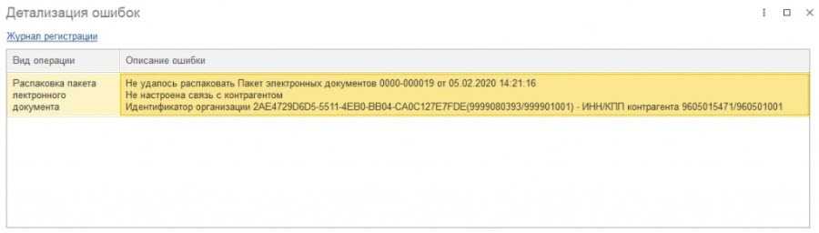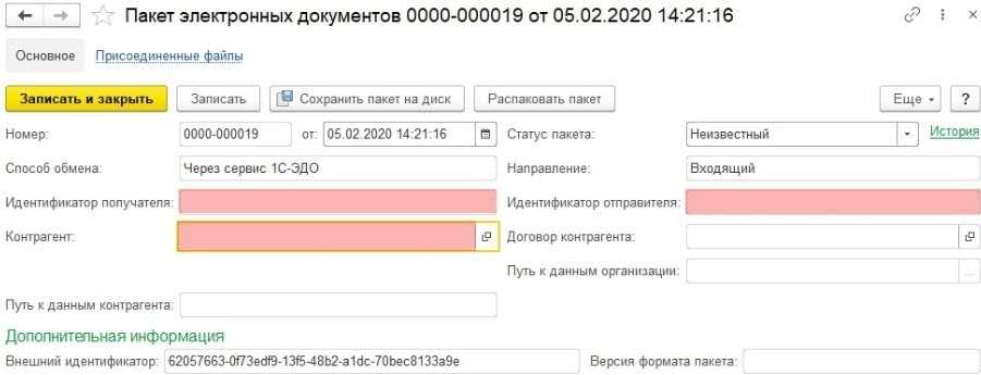 Откройте пакет электронных документов и убедитесь, что отсутствуют обязательные поля, необходимые для распаковки пакета и последующего корректного принятия к учету (идентификатор получателя, идентификатор отправителя, контрагент). Для заполнения этих полей в некоторых случаях необходимо наличие в информационной базе приглашения между участниками ЭДО по данному документу в статусе Присоединен:
