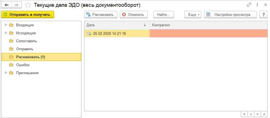 Вернитесь в раздел Текущие дела ЭДО и нажмите кнопку Отправить и получить. С сервера оператора ЭДО в информационную базу будут загружены отсутствующие настройки, и документ успешно распакуется: