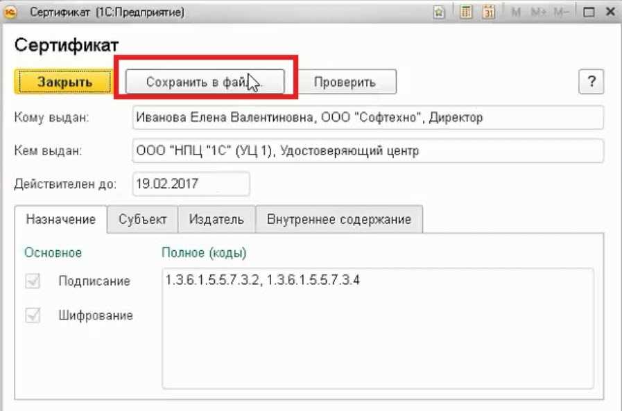 Откройте сертификат двойным нажатием. Нажмите кнопку Сохранить в файле и сохраните сертификат в любую папку на компьютере: