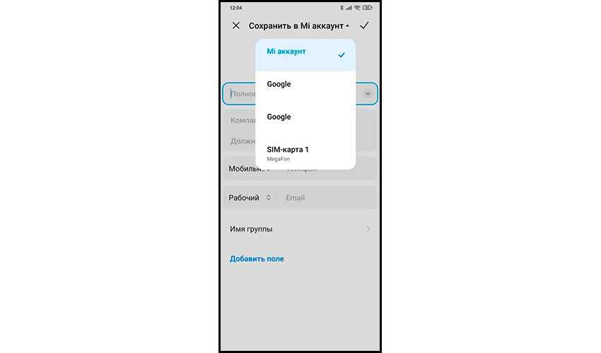 Сверху вы увидите пункт «Сохранить в…», нажав на который вы сможете выбрать место хранения новых контактов. Вы можете выбрать внутреннюю память смартфона, уже упомянутый Google-аккаунт, а также Mi-аккаунт. Вновь советуем выбрать именно ваш аккаунт Google – так надежнее.
