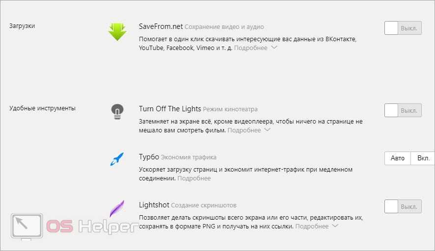 Некорректную работу браузера может вызвать большое количество активных расширений. Особенно в тех случаях, когда речь идет о сомнительных плагинах с низким рейтингом, вносящих изменения в функционал программы. Вам нужно отключить все расширения сразу через настройки Yandex.Browser.
