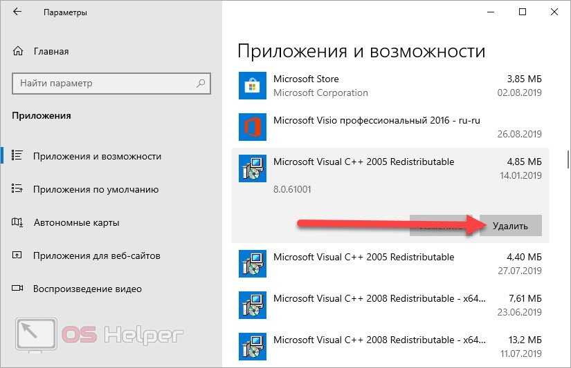 Если предыдущий метод не помог, то с большой долей вероятности проблема заключается в отсутствии нужных библиотек Microsoft Visual C++ и .NET Framework. Сначала необходимо удалить текущие версии с компьютера. Для этого откройте «Приложения» в параметрах системы и поочередно избавьтесь от всех пакетов. Затем перезапустите компьютер.
