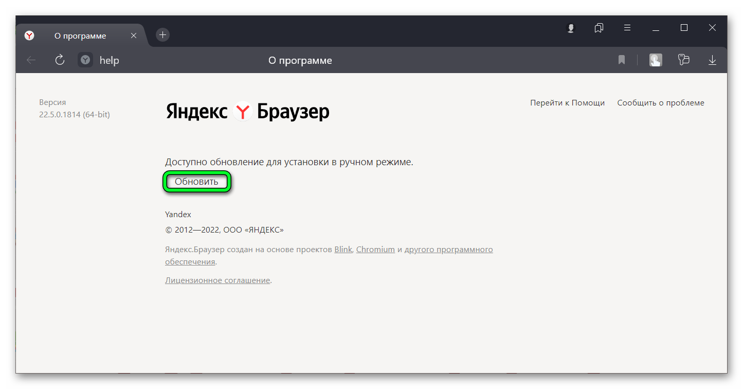 Следующим действием является обновление браузера до актуальной версии. Обозреватель должен автоматически обнаруживать новые апдейты и устанавливать их перед запуском. Однако эта функция может давать сбои, поэтому вам необходимо вручную проверить текущую версию. Для этого откройте меню и в разделе «Дополнительно» выберите пункт «О браузере». На открывшейся странице появится информация о программе. Если установлена старая версия, то вы увидите кнопку «Обновить».