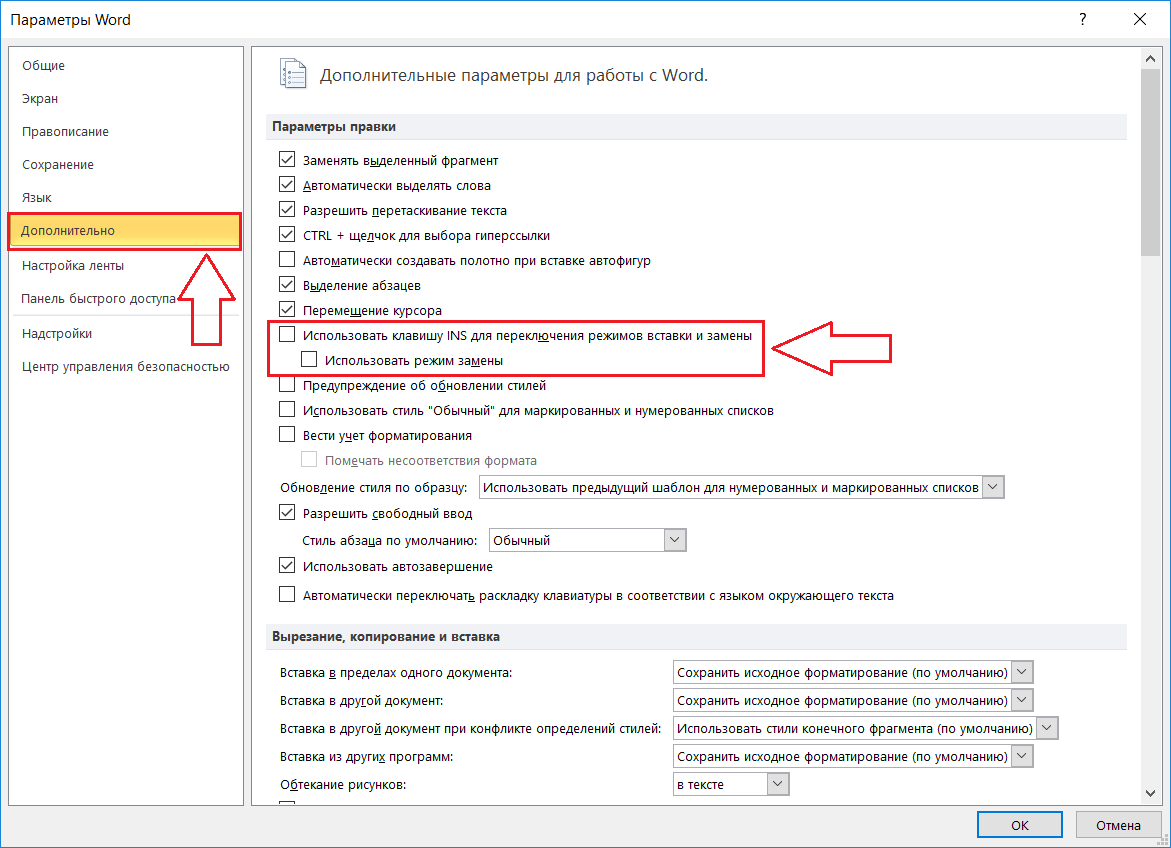 3. В разделе «Параметры правки» снимете галочку с подпункта «Использовать режим замены», расположенного под пунктом .