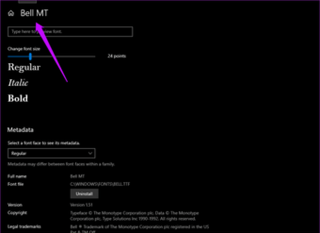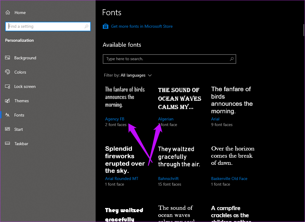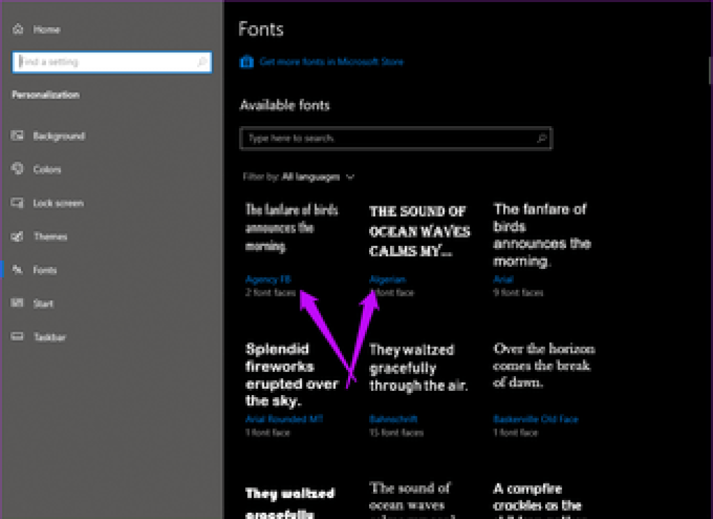 Теперь вы будете перенаправлены в окно «Доступные шрифты» на вашем ПК. Все, что вам нужно сделать, это прокрутить вниз, пока не найдете шрифт, который вам нравится, и запишите его название.