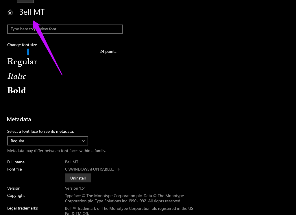 Чтобы увидеть полные метаданные шрифта, щелкните раскрывающийся список и выберите начертание шрифта.
