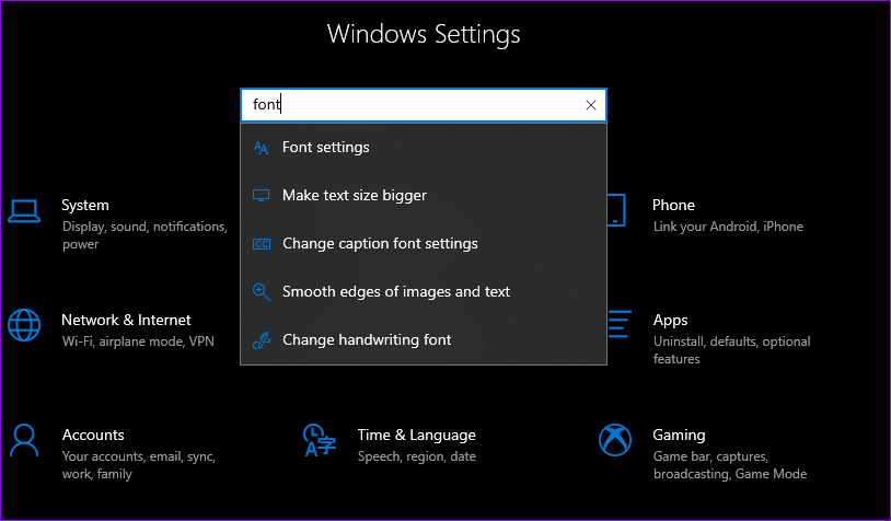 Шаг 1: Запустите настройки Windows и найдите шрифты. Выберите в меню Настройки шрифта.