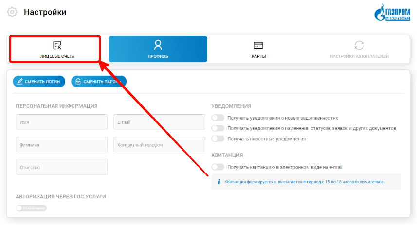 Функции личного кабинета Газпром