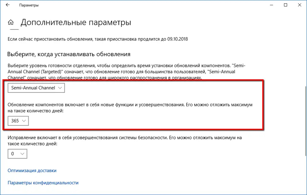 Если вы пользуетесь Windows 10 в ветке Semi-Annual Channel (Targeted), то вы можете отложить новую версию на срок до 365 дней со дня ее первоначального выхода. При переключении на ветку Semi-Annual Channel вы можете отложить новую версию до 365 дней, но ПК на данном уровне готовности получит обновление функций через 4 месяца после того, как он будет доступен в “Полугодовом канале (целевой)”. Таким образом, используя ветку Semi-Annual Channel вы можете суммарно отложить обновление функций до 16 месяцев.