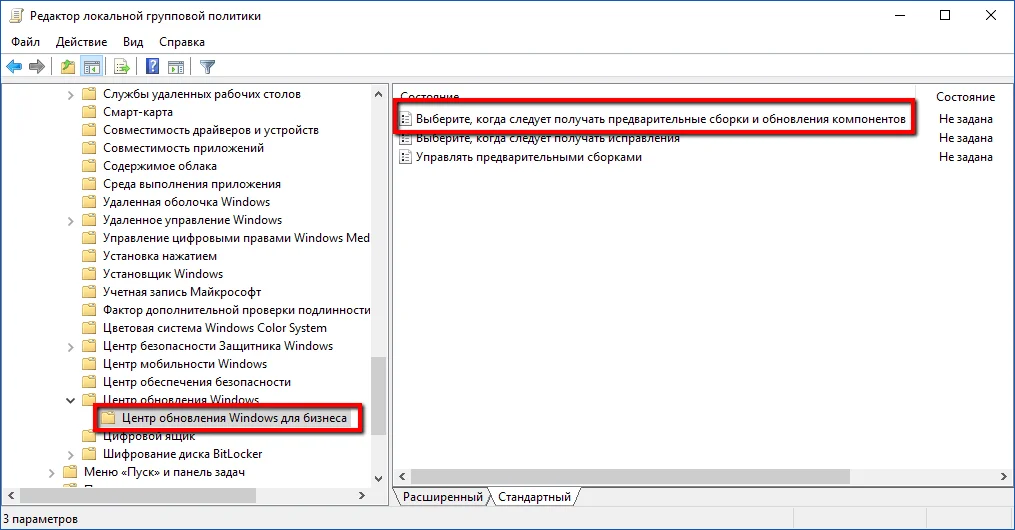 Щелкните дважды по политике Выберите, когда следует получать предварительные сборки и обновления компонентов.