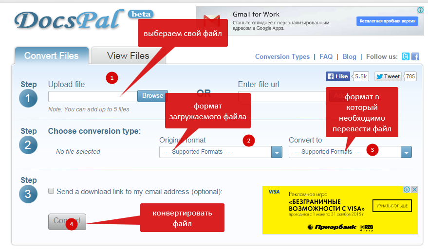 Чем лично мне нравится онлайн конвертерDocsPal: регистрация на сервисе не требуется; максимальная загрузка файлов за один раз – 5 штук; сконвертированный файл можно скачать в течение 5 суток; ссылку на сконвертированный файл можно отправить заинтересованному лицу; на сервисе можно сделать E-книгу для book reader, iPhone, iPad.