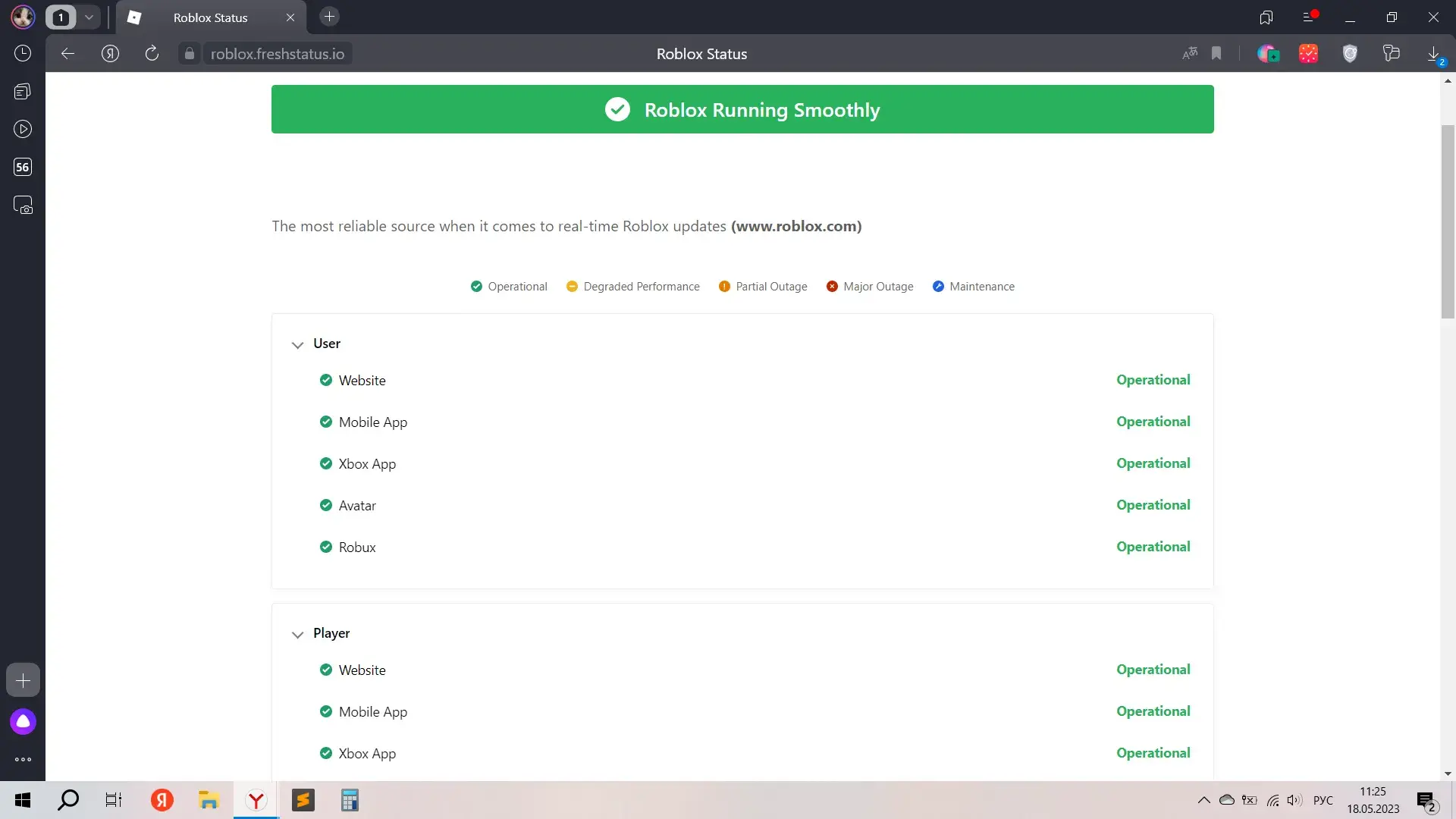 Неполадки могут вызвать ошибки со стороны Роблокса. Проверить это можно, проверив состояние серверов игры. Для этого был создан специальный сайт — roblox.freshstatus.io. На нем можно увидеть, как работает платформа.